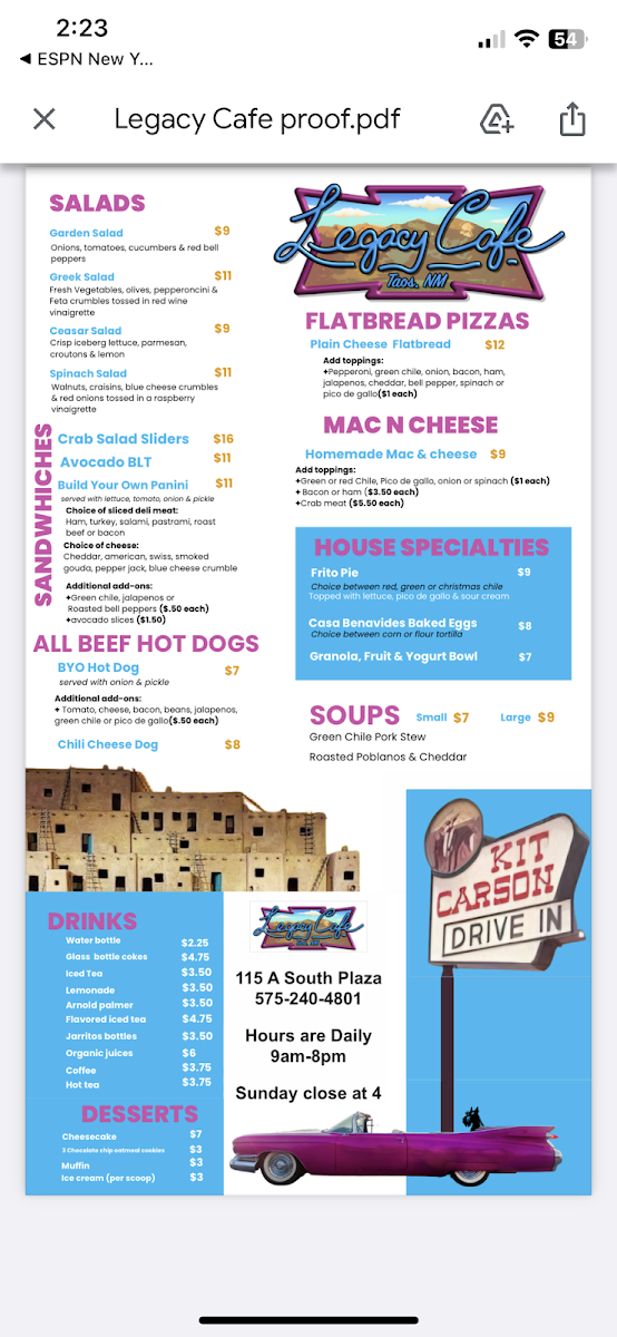 At Legacy Café, the menu offers a variety of options suitable for breakfast, casual meals, and coffee breaks. The food selection includes hearty dishes such as Green Chile Stew Soup, hot dogs, crab salad sliders, and flatbread cheese pizzas. There is also a panini with pastrami, salads, and a Granola Yogurt Fruit Bowl for lighter choices. For customization, guests can build their own mac-n-cheese.