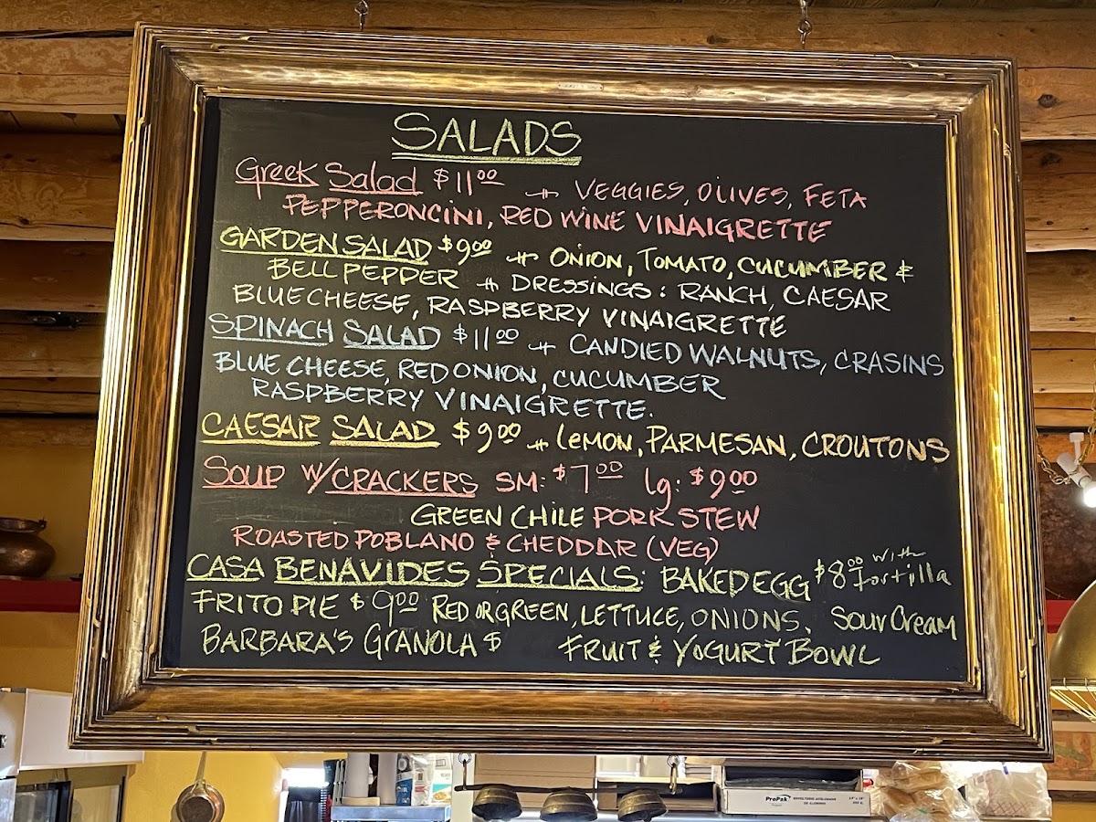 - Sides: Includes items like eggs by the piece, red and green chile sides, avocado, bacon, ham, sausage, corn and flour tortillas, sourdough toast, bags of chips in classic and BBQ flavors, plus house and Caesar salads.